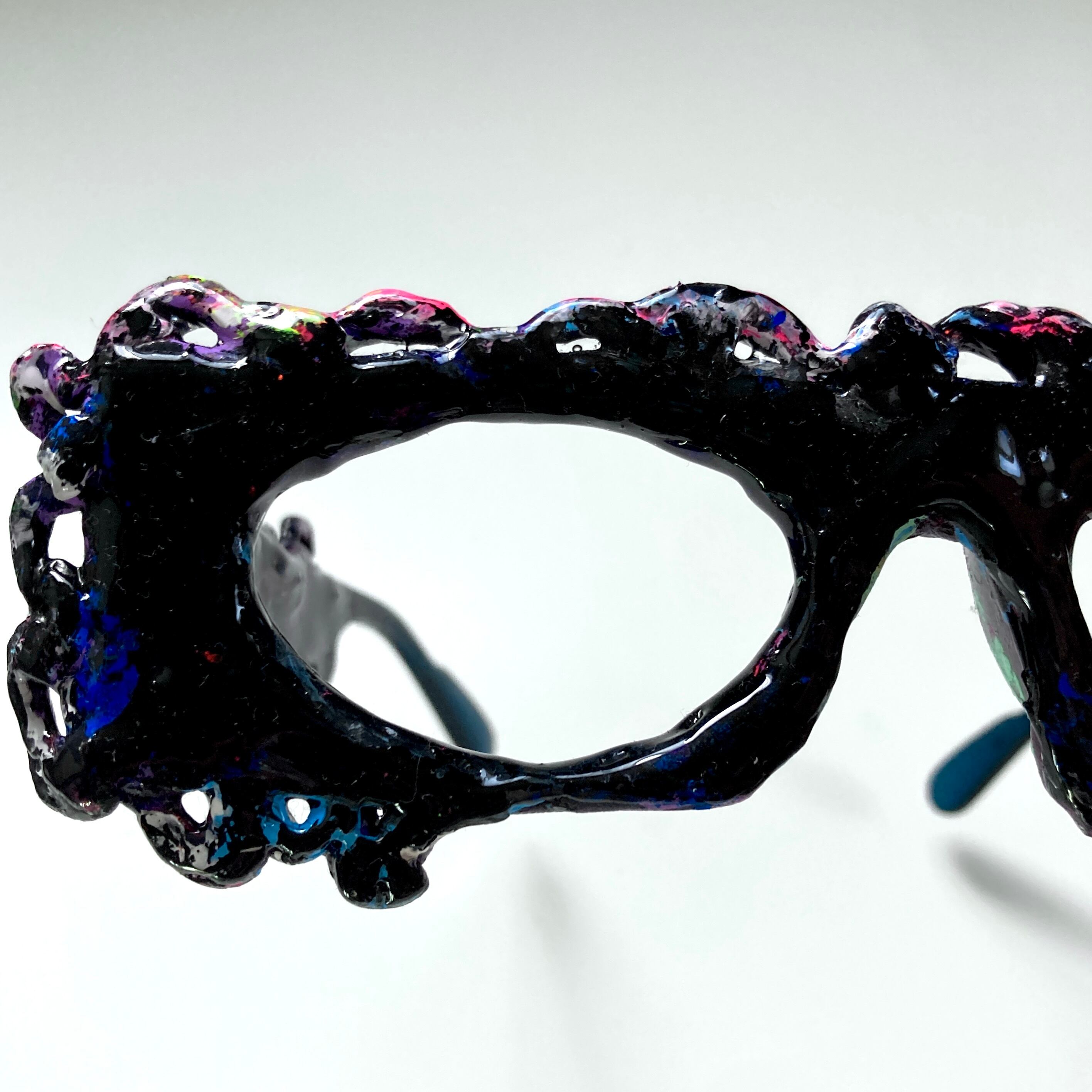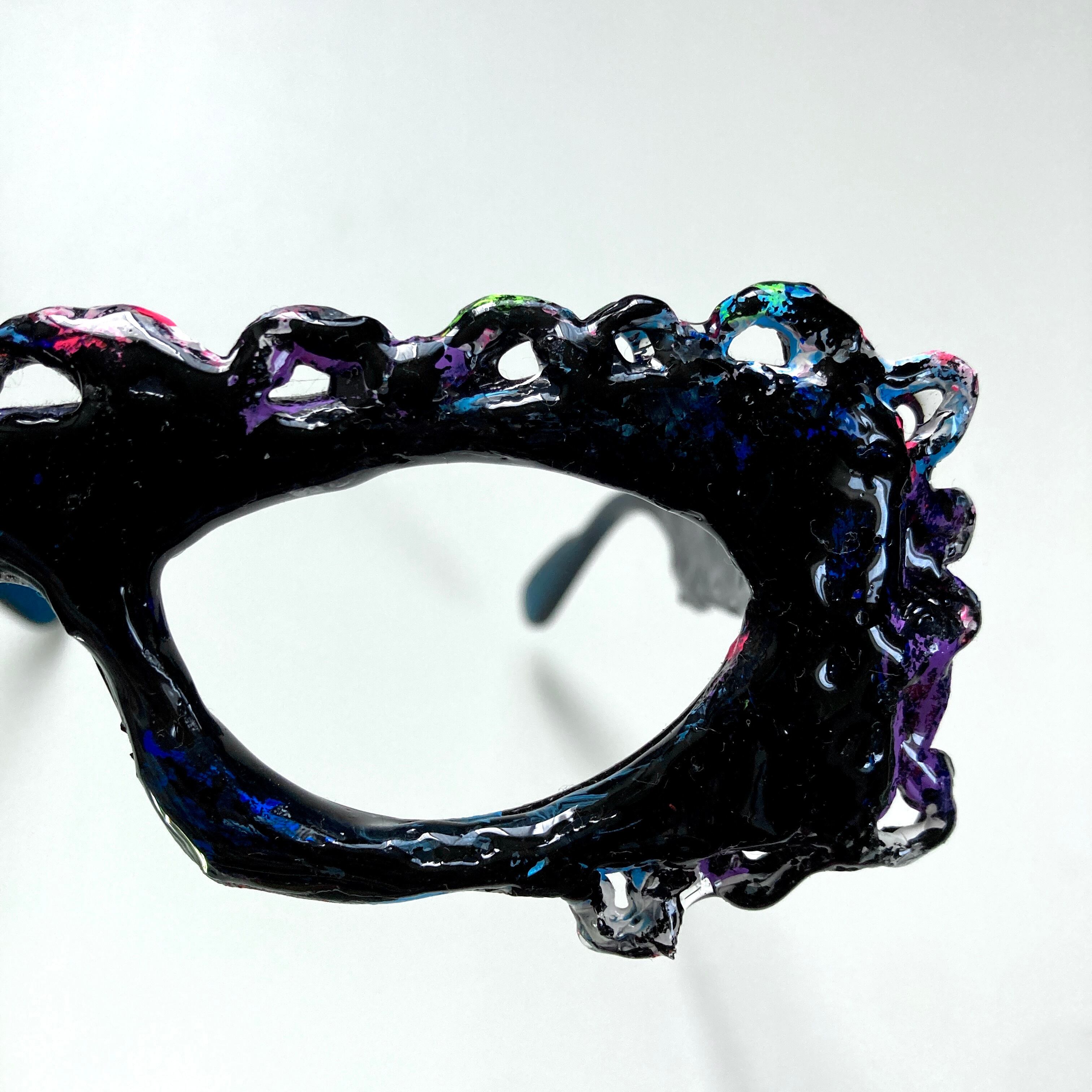 パテで装飾していて丈夫です。また、UVレジンでコーティングしてあるので、テカテカしています。内側、耳に当たる部分、ネジで固定してある部分は、肌の当たりを良くするため、あえて着色やコーティングはしていません。