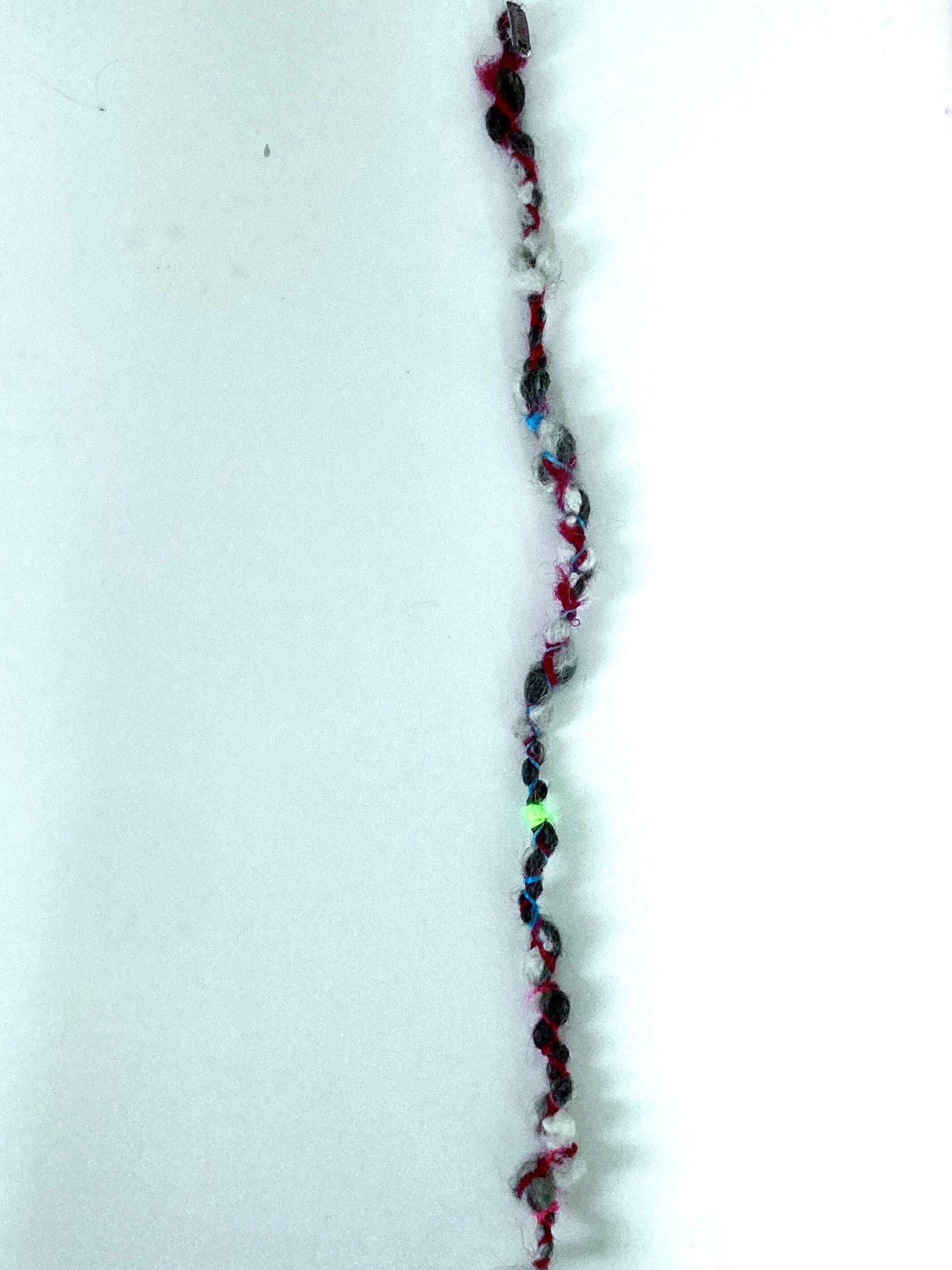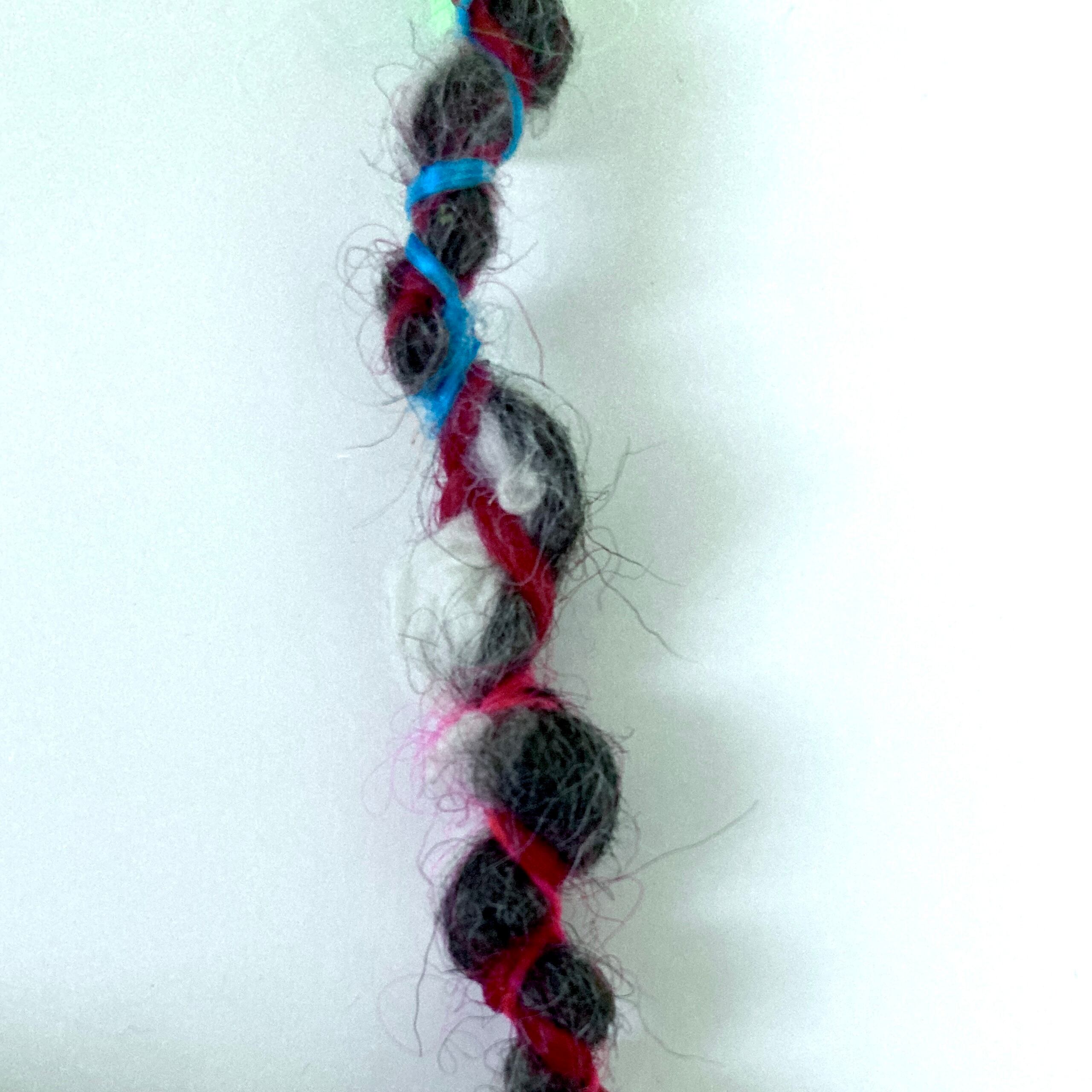 白と黒の羊の原毛を混ぜて使い赤や青の